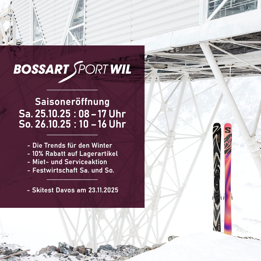 HOMENEWSEVENTS/ KURSEÜBER UNSSTELLENGALERIENKONTAKTGANZJAHRES-SPORTARTENSCHNEESPORTSPORTSCHUHEMIET- UND SERVICECENTERTEAMBEKLEIDUNG / ARBEITSBEKLEIDUNGZUBEHÖR GANZJAHRES-SPORTARTENSCHNEESPORTSPORTSCHUHEMIET- UND SERVICECENTERTEAMBEKLEIDUNG / ARBEITSBEKLEIDUNGZUBEHÖR Ihr Spezialistfür Sportartikel in WilBERATUNG VOR ORTWir nehmen uns Zeit für SieKOMMEN SIE VORBEIMehr als 800m² voll mit Sport zu den News Zu den News StandortÖffnungszeitenHeute13.30 – 18.30 UhrHeute08.00 – 12.00 Uhr13.30 – 18.30 UhrHeute08.00 – 12.00 Uhr13.30 – 18.30 UhrHeute08.00 – 12.00 Uhr13.30 – 18.30 UhrHeute08.00 – 12.00 Uhr13.30 – 18.30 UhrHeute08.00 – 17.00 Uhrund durchgehend